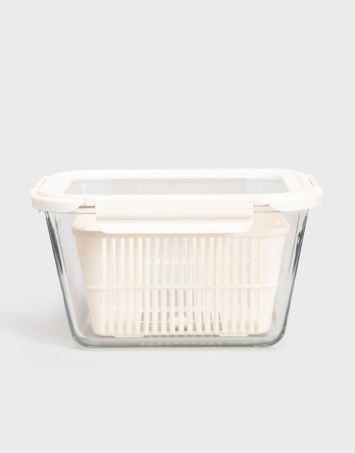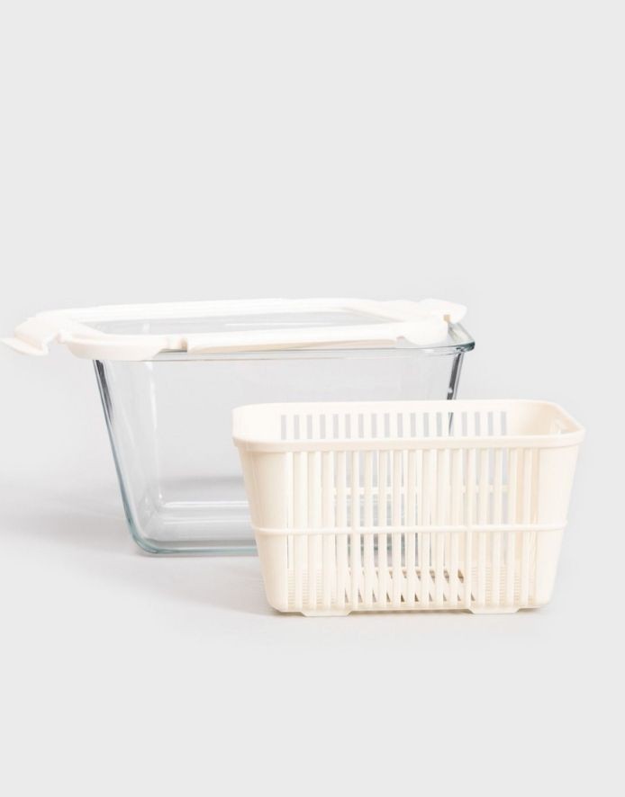 NEGOZIO container with basket is designed for storing fresh vegetables, fruits, lettuce, mozzarella and other products that need to be drained. The removable insert allows you to conveniently separate the contents from excess liquid, and the tightly closing lid preserves freshness.