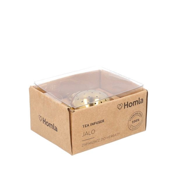 The JALO teapot-shaped tea strainer is golden, 6x5 cm in size. A delicate chain is attached to it, which makes it easy to pull out of the water. The base is circular in shape. All elements are soft golden.