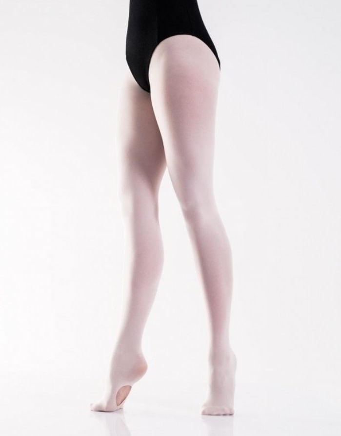 Transformable dance tights with an elastic opening at the bottom that allows them to be transformed into leggings.