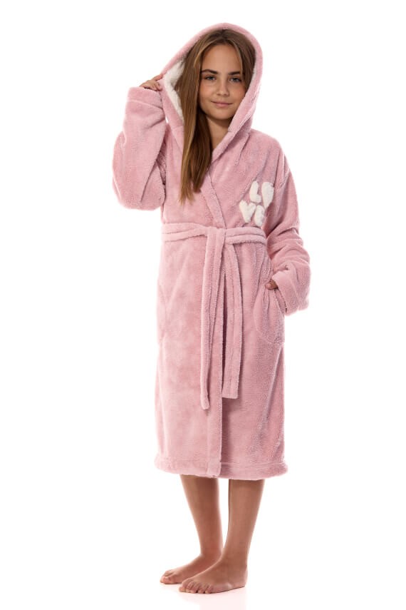 Pūkains, mīksts, jauks halāts bērniem. modelēta ar kapuci, kabatām, piesprādzēta ar tāda paša auduma siksniņu. Lieliska izvēle omulīgiem vakariem pēc peldēšanās vai brīnišķīgiem rītiem terasē, malkojot kakao.