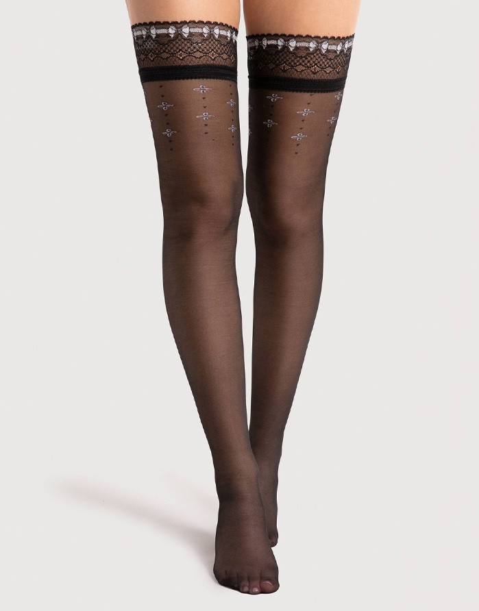 Seksīgas zeķes no zīmola "Fiore". Mežģīņu lente ar silikonu iekšpusē, kas neļauj zeķēm nokrist. Smalki pastiprināta purngala daļa.