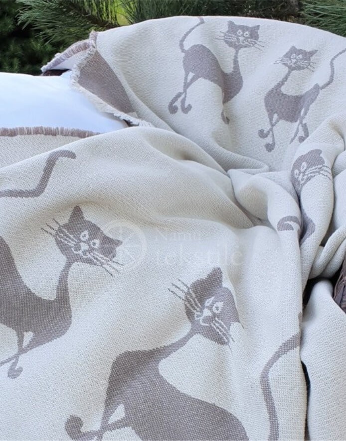 Žakarda auduma paklāji ir izgatavoti no 100% kokvilnas ar jautru kaķēnu rakstu. Dabīgās šķiedras paklājs tiek izmantots segas vietā karstās vasaras naktīs, tas nav jāietin. Kokvilna labi uzsūc mitrumu, ir maiga pret ķermeni un neizraisa alerģiju. Šis paklājs ir lieliska izvēle piknikam vai laiskai atpūtai pludmalē.