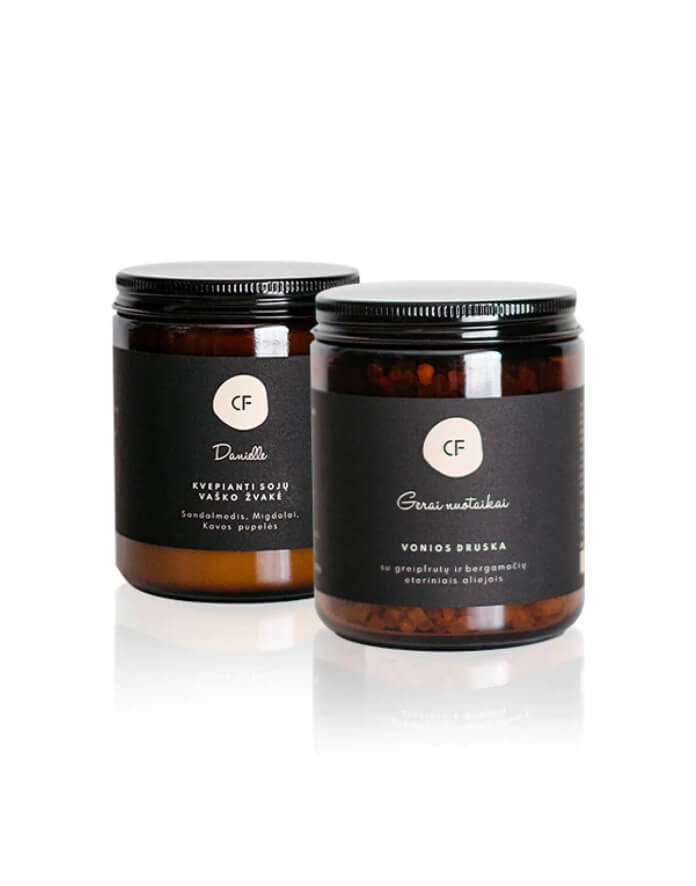 Komplektā ietilpst dabīgā sojas vaska svece un vannas sāls.