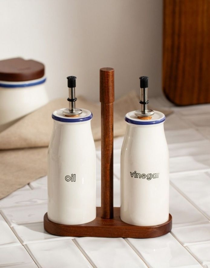 Элегантные диспенсеры для масла и уксуса на подставке. Благодаря компактному размеру и элегантному дизайну они впишутся в самые разные интерьеры — от современных до классических. Этот набор идеально подходит как для повседневного использования, так и для особых случаев.