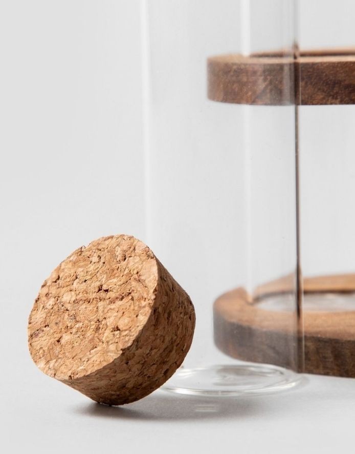 Элегантные стеклянные банки с крышками из натуральной пробки идеально подойдут для хранения любимых специй и трав. Набор расположен на компактной деревянной подставке, которая не только облегчает организацию, но и добавляет стильный акцент.
