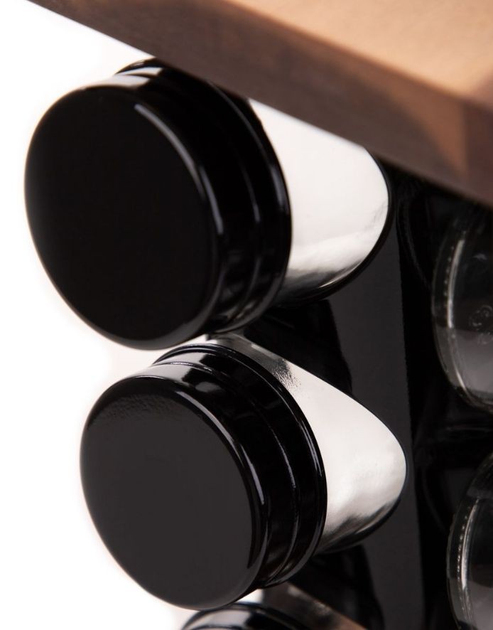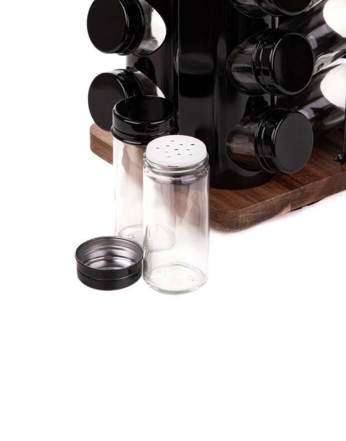 - 12 стеклянных банок имеют плотно закрывающиеся крышки, которые защищают специи от влаги и потери аромата.