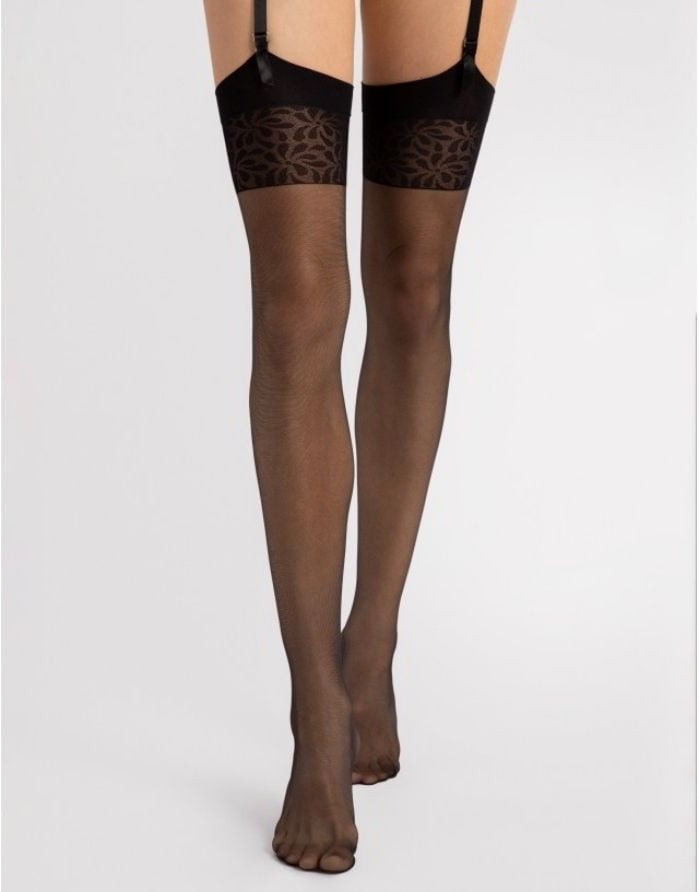 Seksualios, prisegamos moteriškos kojinės. Dekoruotos plačia rašuota juosta.