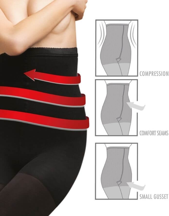 Корректирующие колготки с высокой талией. Трусики обеспечивают идеальную посадку, а соответствующие компрессионные зоны корректируют живот, подчёркивая и подчеркивая ягодицы.